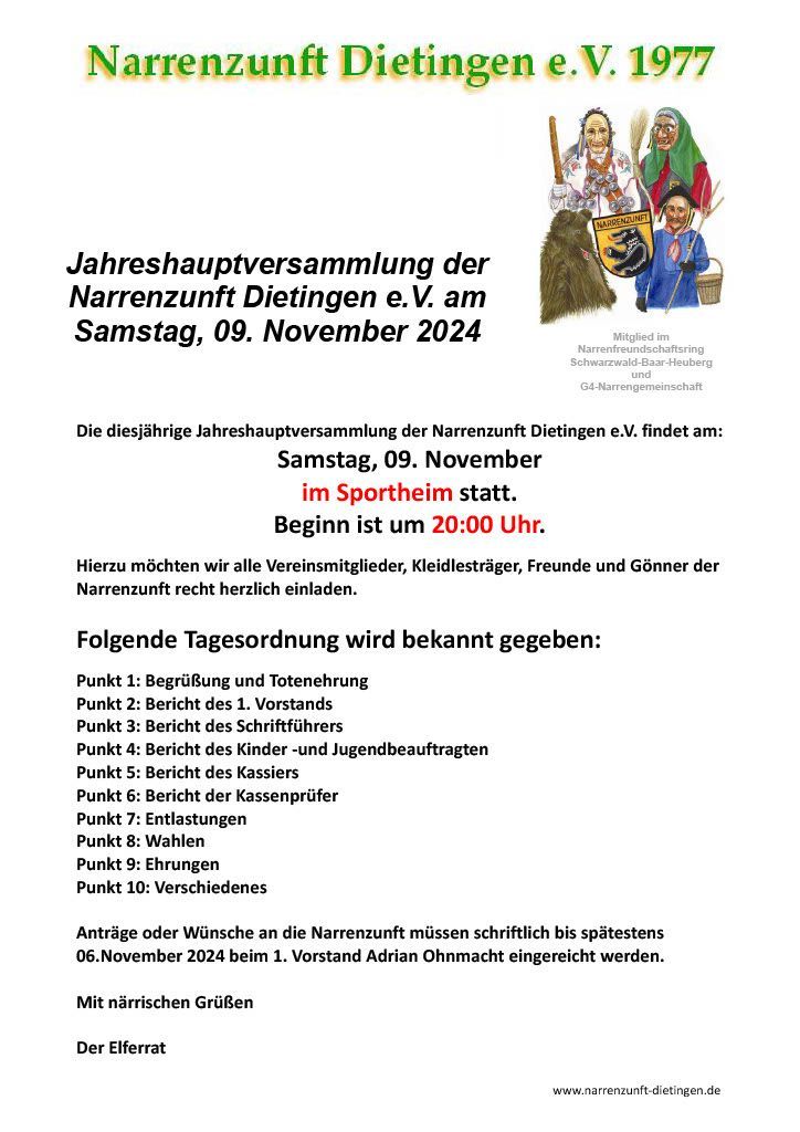 Informationen zur Jahreshauptversammlung der Narrenzunft Dietingen e.V.