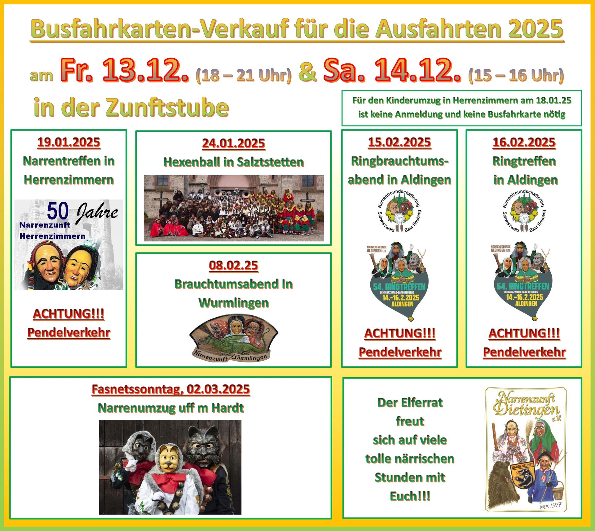 Alle Änderungen bezüglich Abfahrtszeiten, Abfahrtsplätzen oder anderer relevanter Informationen werden über die WhatsApp-Community der Narrenzunft bekannt gegeben.